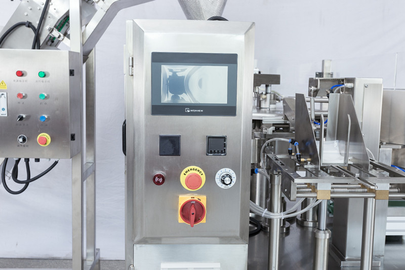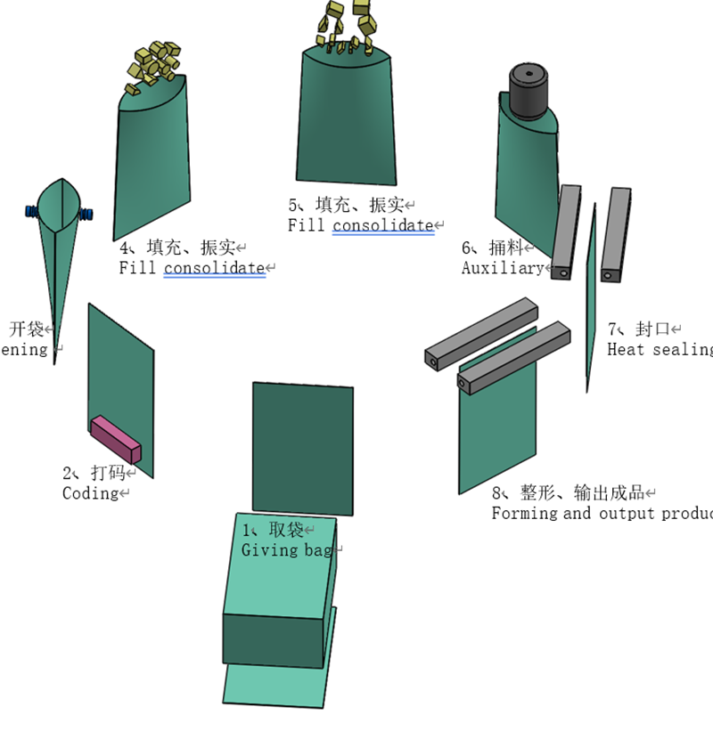 Giving bag→coding →opening →filling 1 →filling 2→ auxiliary→ exhaust→heat sealing→ .forming and output product 給(gěi)袋(dài)-打碼-開袋-下料1-下料2-空位(捅料)-排氣-熱封-整(zhěng)形輸出 |