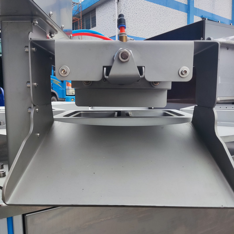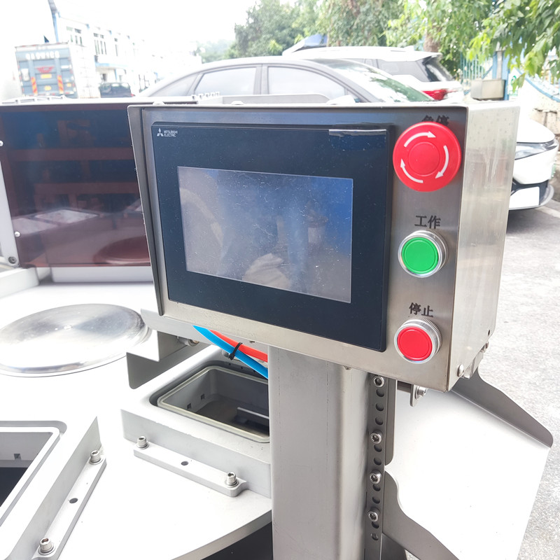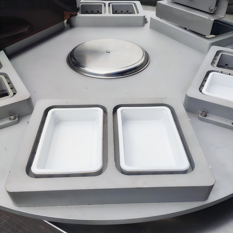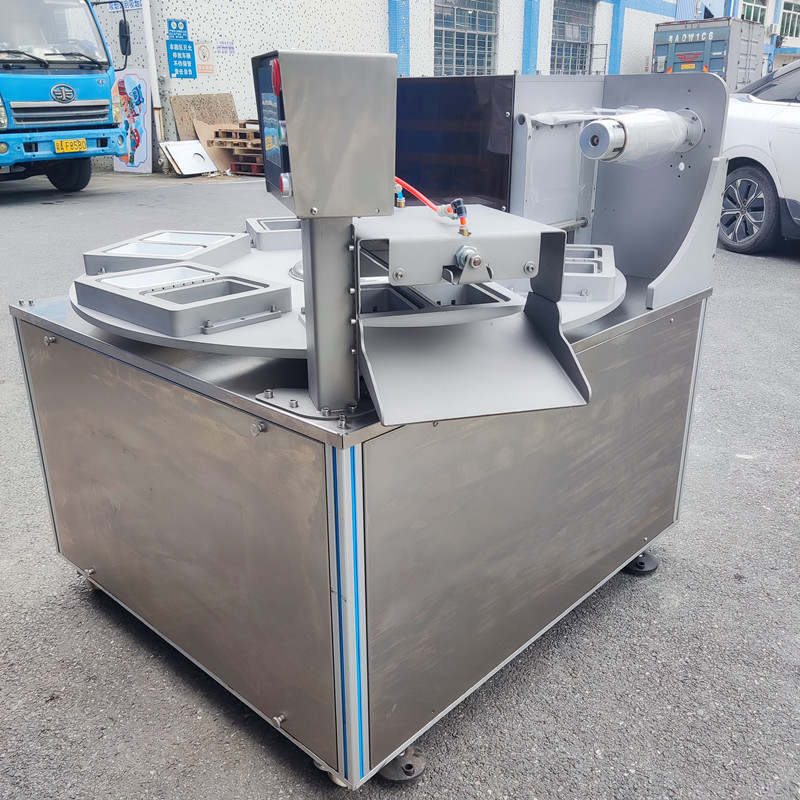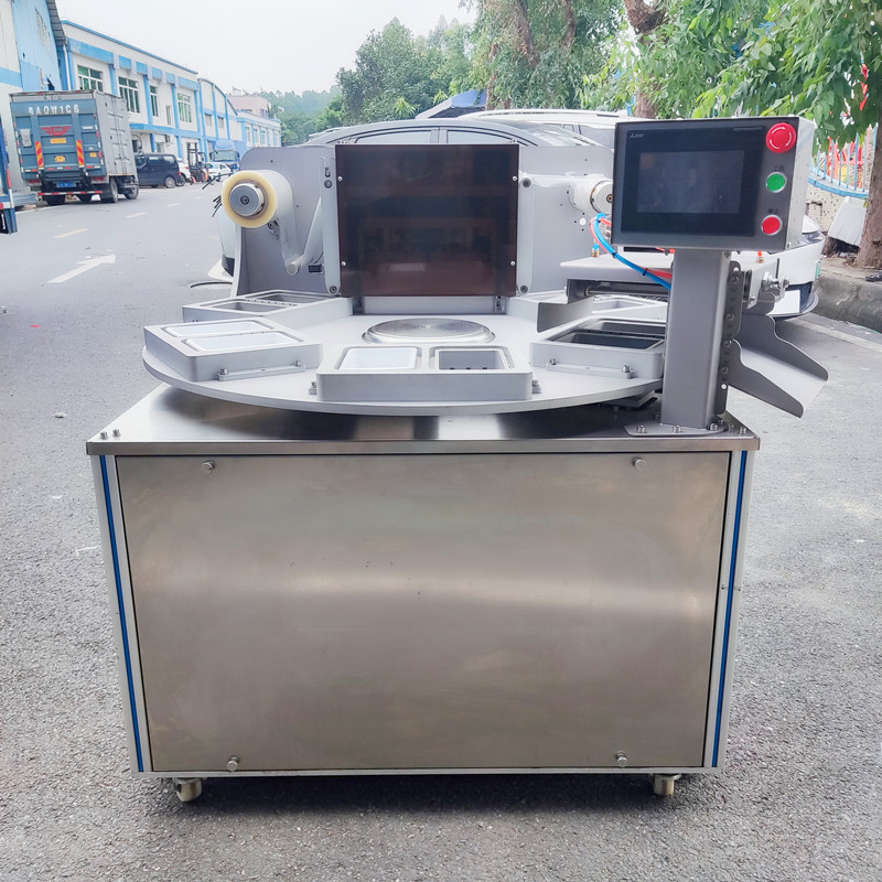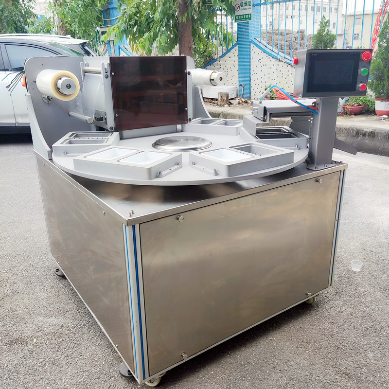 機器為旋轉式,在旋轉盤(pán)上分布6個工位,每個工位有(yǒu)1-2個(gè)模具,其中兩個工位用於擺(bǎi)放托盒,一個工位(wèi)用於產品(pǐn)盒檢測,一(yī)個工位用於產品封口包裝,一個工(gōng)位用於推出(chū)物(wù)料,剩下一個工位屬於(yú)安全預留位置。工作時先將產品放在托盒(hé)裏,再將托盒放入設備的(de)放料區模具內,托盒(hé)隨著(模具)轉盤的轉動運行進入到封口模具裏,封口模模具下降,在封口模具裏將(jiāng)上(shàng)膜(mó)附在托盒上,先抽真空(或氣調(diào))再封口、(上膜和托盒封(fēng)在(zài)一起(qǐ))衝切。包裝好的產品隨著轉盤轉動(dòng)繼續向前運行,從出料口用氣缸托(tuō)起托盒,撥杆推出托盒,完成產品(pǐn)包裝。